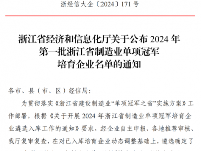 乐鱼电竞入选浙江省经济和信息化厅公布的2024年第一批制造业单项冠军培育企业名单
